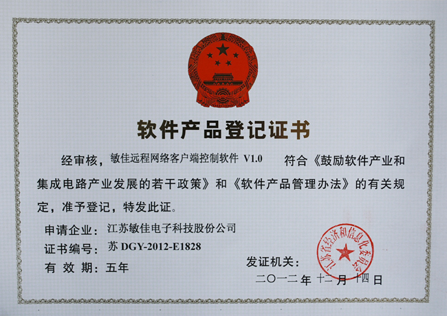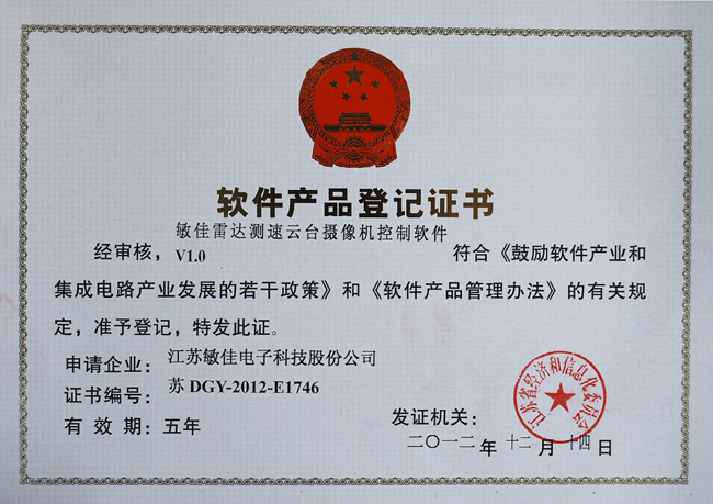 2012年12月14號(hào),我公司獲得了由江蘇省經(jīng)濟(jì)和信息化委員會(huì)頒發(fā)的軟件產(chǎn)品登記證書。此次,又有二個(gè)產(chǎn)品經(jīng)審核符合《鼓勵(lì)軟件產(chǎn)業(yè)和集成電路產(chǎn)業(yè)發(fā)展的若干政策》和《軟件產(chǎn)品管理辦法》的有關(guān)規(guī)定,被認(rèn)定為軟件產(chǎn)品,其中包括:敏佳雷達(dá)測試云臺(tái)攝像機(jī)控制軟件V1.0、敏佳遠(yuǎn)程網(wǎng)絡(luò)客戶端控制軟件V1.0。